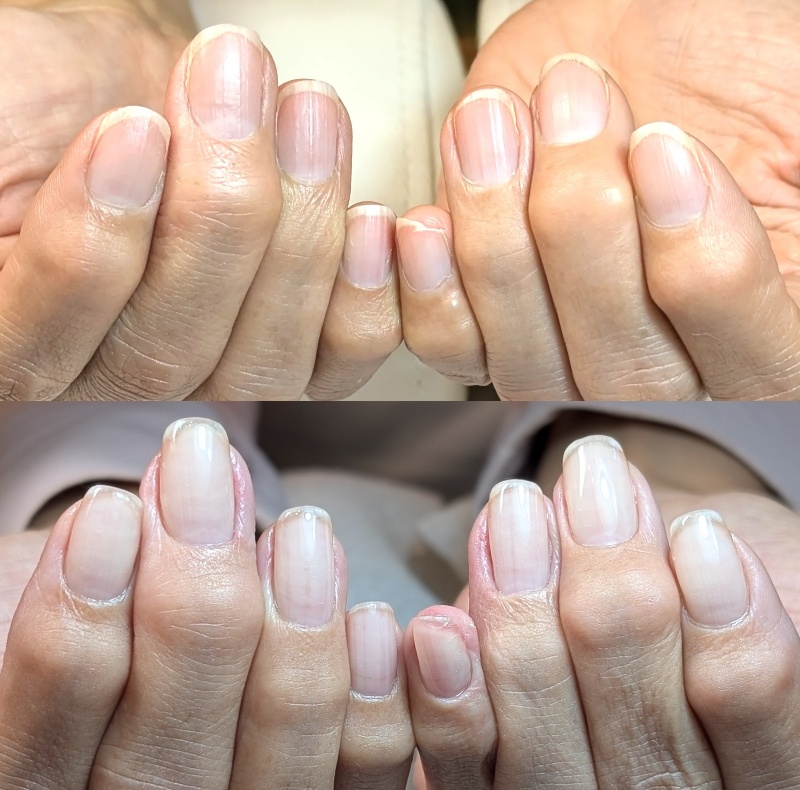 自爪をいたわりながらネイルを続けて頂きたい。ジェルネイルは特殊なベース作りをし、フィルイン(アセトンを使わずお直し)をしています。