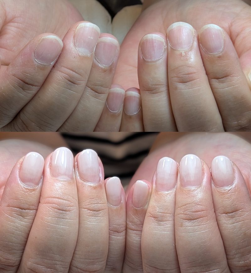 写真下はカラー塗ってるので自爪のピンクみえないですが、爪の白い部分はは1ミリ以下に整えています☺️